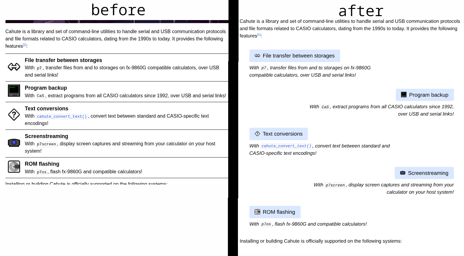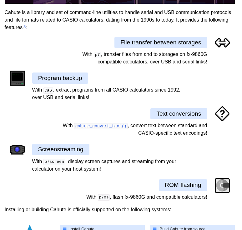 Alors mi-février 2024, je me suis motivé et j'ai recommencé un projet similaire à la libcasio, mais avec les expériences que j'ai eues entretemps (beaucoup de documentation, un recours à la simplicité bien plus présent, et plus d'expérience en général), et un scope plus limité dans un premier temps : avoir les mêmes features que la dernière release de la libp7 et des p7utils, mais sous une forme plus maintenable et, surtout, documentée cette fois. Cet objectif a été atteint avec la release 0.1 de Cahute, qui a lancé ce topic !