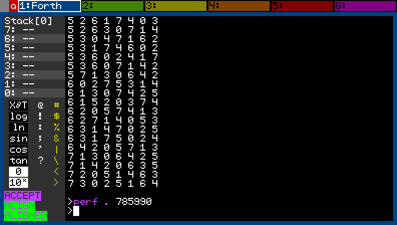 I have a lot of ideas for improving speed and decided to use N queens as a benchmark. My first attempt at a Forth version works but is not especially elegant. With printing the results as shown in the screenshot, the calculator takes 22 seconds for 8 queens (the screenshot is from the PC version so only took 785ms). Without printing the results, the calculator only takes 668ms! This seems like a good start and I can start optimizing trying to lower that number.